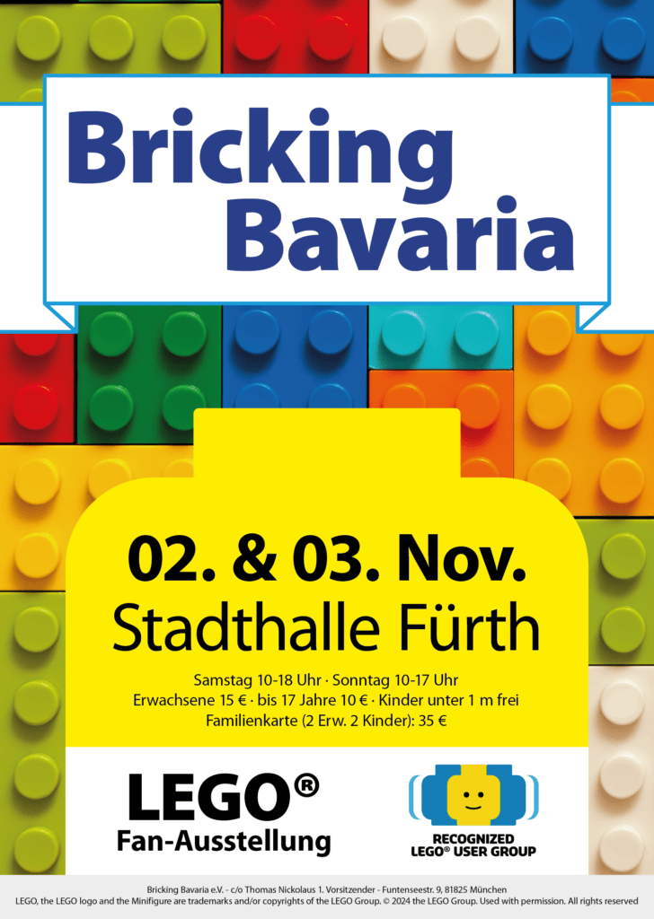 Bricking Bavaria e.V. cordially invites you to the twentieth LEGO exhibition with fan event under the name “Bricking Bavaria”! This time we will be guests at the Stadthalle Fürth near Nuremberg on 2nd and 3rd November 2024.