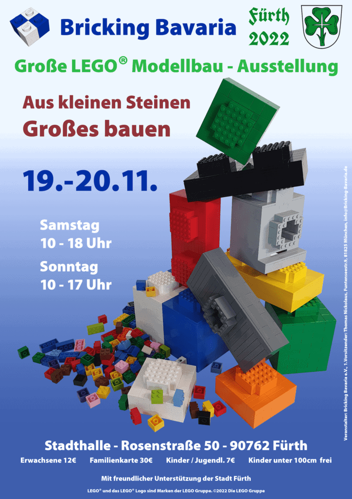 Bricking Bavaria e.V. cordially invites you to the eighteenth LEGO exhibition with fan event under the name “Bricking Bavaria”! This time we will be guests at the Stadthalle Fürth near Nuremberg on 19 and 20 November 2022.